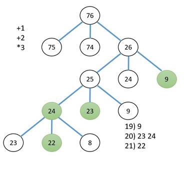 Два игрока, Петя и Ваня, играют в следующую игру. Перед игроками лежит куча камней. Игроки ходят по очереди, первый ход делает Петя. За один ход игрок может добавить в кучу один или два камня или увеличить количество камней в куче в три раза. Например, имея кучу из 15 камней, за один ход можно получить кучу из 16, 17 или 45 камней. У каждого игрока, чтобы делать ходы, есть неограниченное количество камней. Игра завершается в тот момент, когда количество камней в куче становится не менее 76. Победителем считается игрок, сделавший последний ход, то есть первым получивший кучу, в которой будет 76 или больше камней. В начальный момент в куче было S камней, 1 ≤ S ≤ 75.