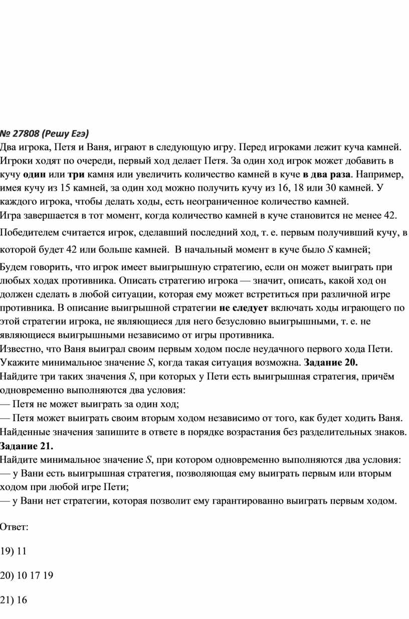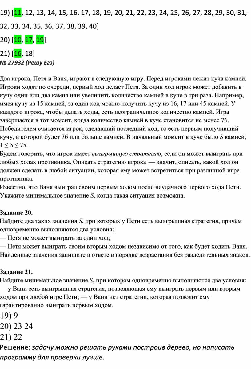 19) Петя сделал неудачный ход, поэтому, 42 делим дважды на 2: 42 / 2 / 2 = 10,5. В 19 задании получившийся ответ увеличиваем в большую сторону, то есть ответ 11.