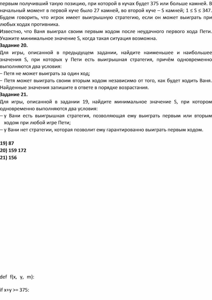 В 20 и 21 заданиях получившийся ответ уменьшаем в меньшею сторону при делении. def f(x, m): if x >= 42: