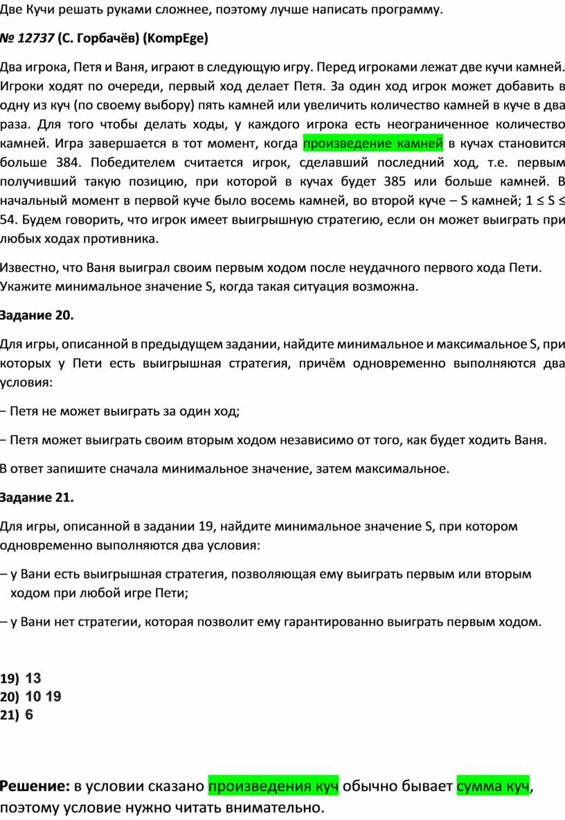 В задачах 19 – 21 может попасться ОДНА КУЧА или ДВЕ КУЧИ.