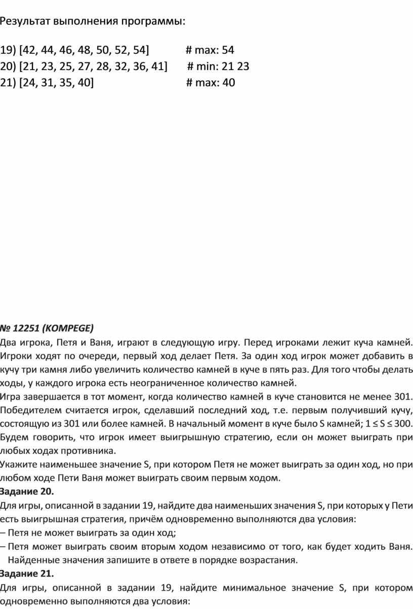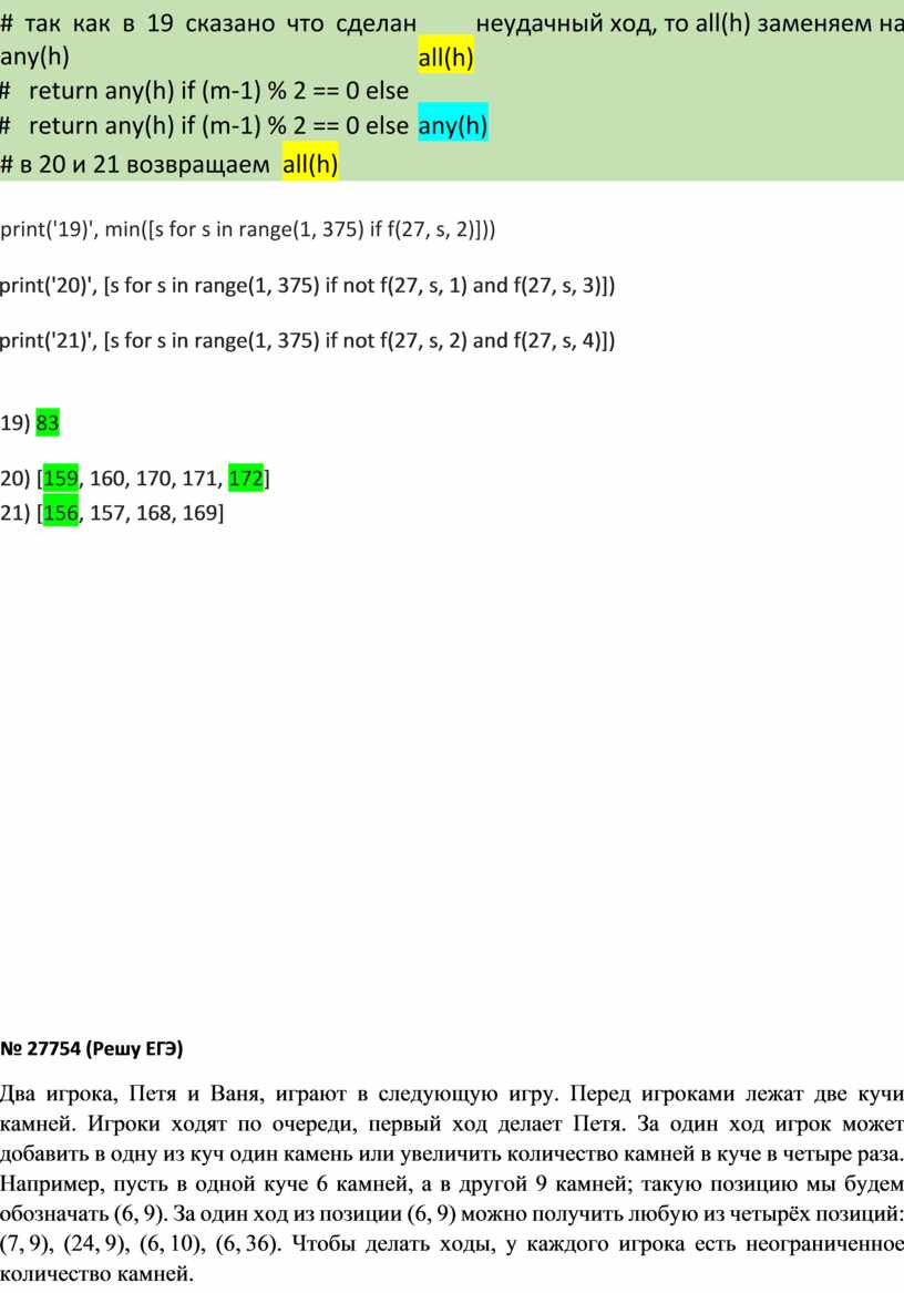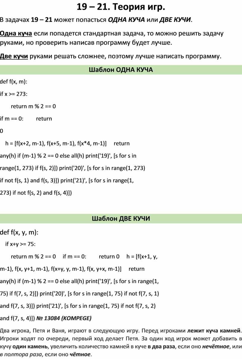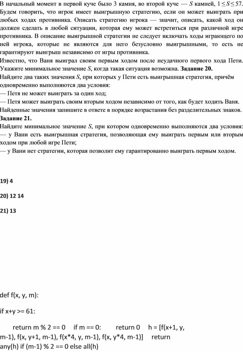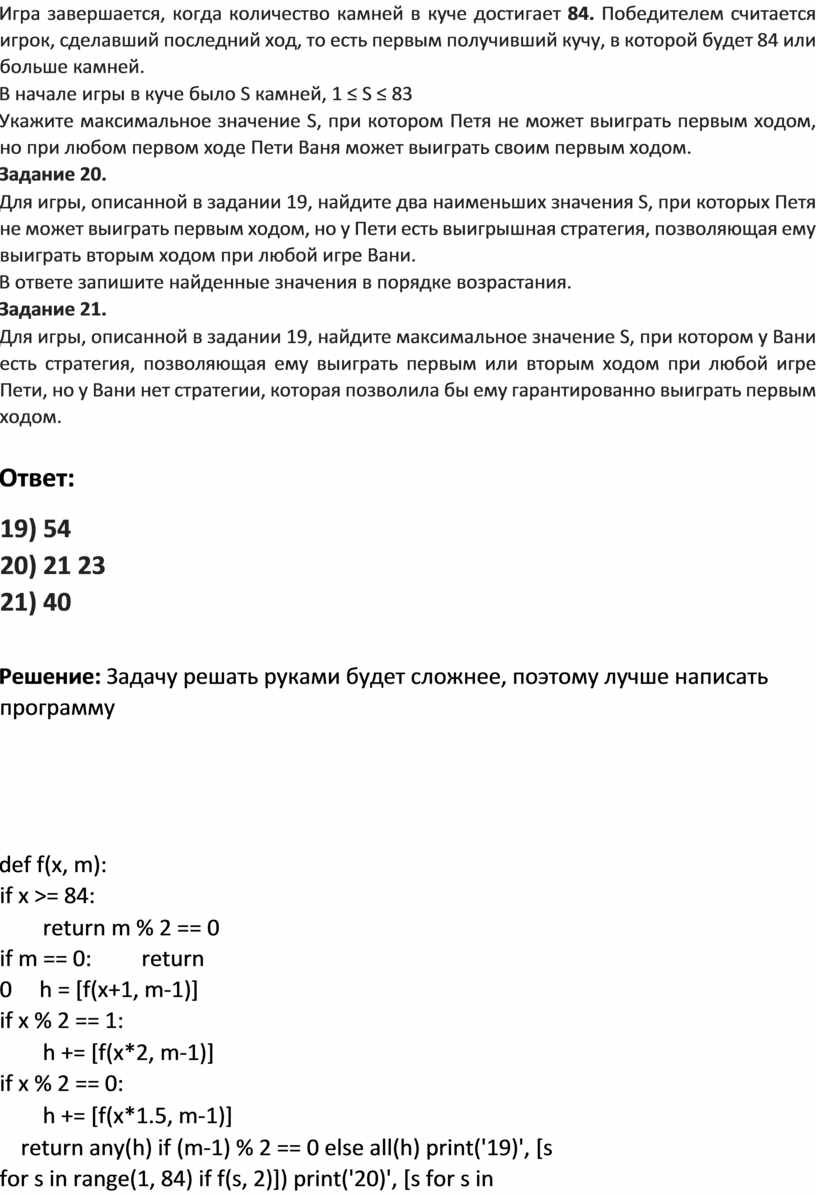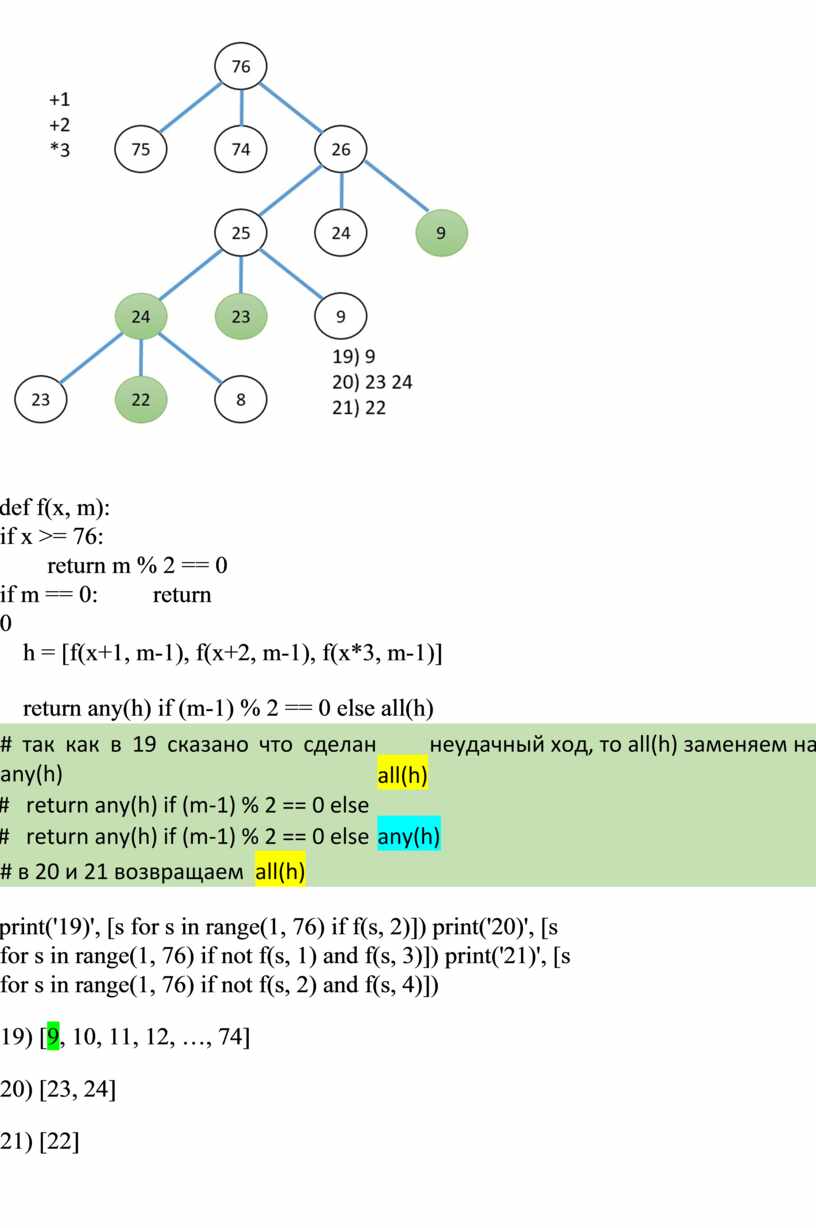 return m % 2 == 0 if m == 0: return 0 h = [f(x+1, y, m-1), f(x, y+1, m-1), f(x+y, y, m-1), f(x, y+x, m-1)] return any(h) if (m-1) % 2 == 0 else all(h) print('19)', [s for s in range(1, 75) if f(7, s, 2)]) print('20)', [s for s in range(1, 75) if not f(7, s, 1) and f(7, s, 3)]) print('21)', [s for s in range(1, 75) if not f(7, s, 2) and f(7, s, 4)]) № 13084 (KOMPEGE)