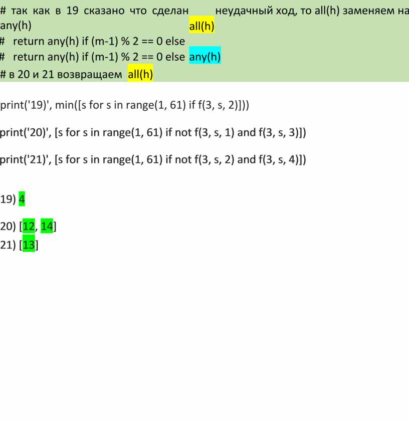 h = [f(x+2, m-1), f(x+5, m-1), f(x*4, m-1)] return any(h) if (m-1) % 2 == 0 else all(h) print('19)', [s for s in range(1, 273) if f(s, 2)]) print('20)', [s for s in range(1, 273) if not f(s, 1) and f(s, 3)]) print('21)', [s for s in range(1, 273) if not f(s, 2) and f(s, 4)])