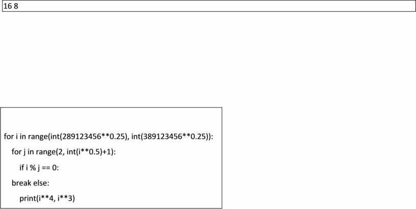 for i in range(int(289123456**0.25), int(389123456**0.25)): for j in range(2, int(i**0.5)+1): if i % j == 0: break else: print(i**4, i**3) |