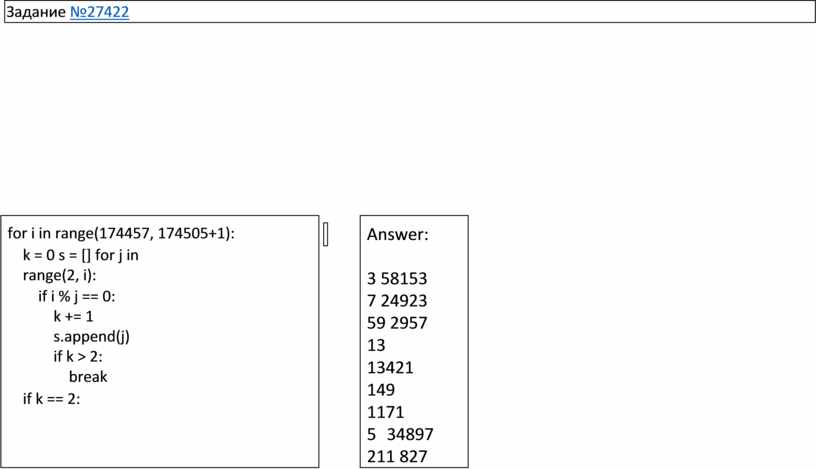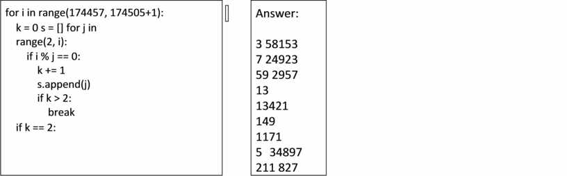 for i in range(174457, 174505+1): k = 0 s = [] for j in range(2, i): if i % j == 0: k += 1 s.append(j) if k > 2: break if k == 2: |