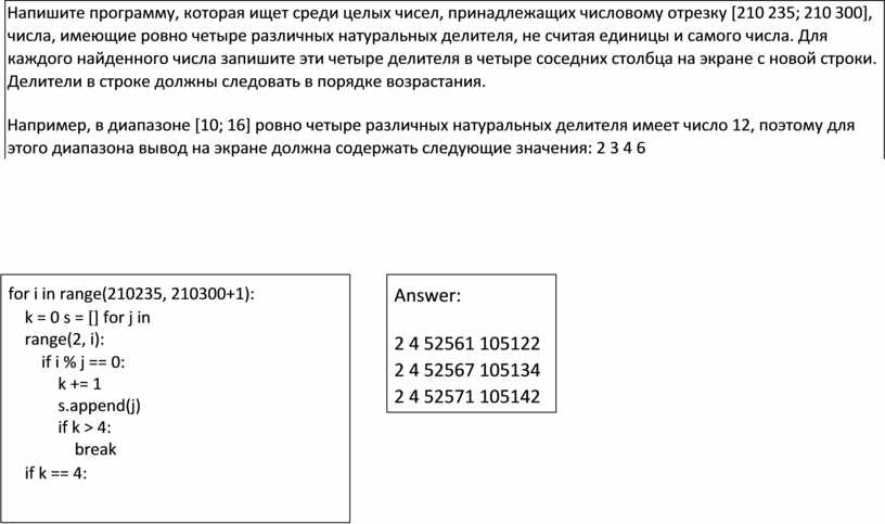 Напишите программу, которая ищет среди целых чисел, принадлежащих числовому отрезку [210 235; 210 300], числа, имеющие ровно четыре различных натуральных делителя, не считая единицы и самого числа. Для каждого найденного числа запишите эти четыре делителя в четыре соседних столбца на экране с новой строки. Делители в строке должны следовать в порядке возрастания.