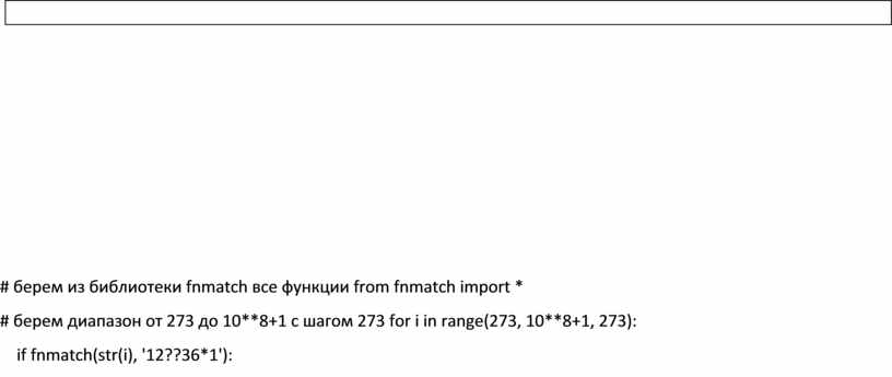 # берем из библиотеки fnmatch все функции from fnmatch import * # берем диапазон от 273 до 10**8+1 с шагом 273 for i in range(273, 10**8+1, 273): if fnmatch(str(i), '12??36*1'): print(i, i//273) |