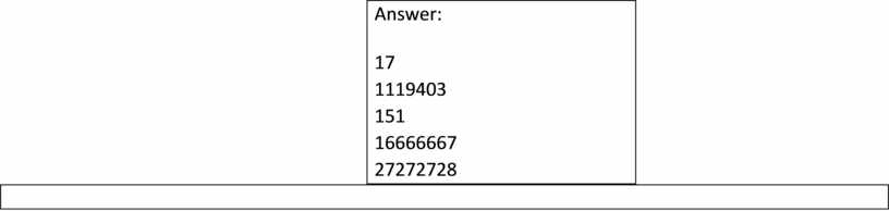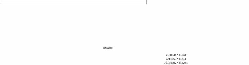 Answer: 71503447 31541 72115537 31811 721543027 318281 748815037 330311 752215537 331811 781573187 344761 |