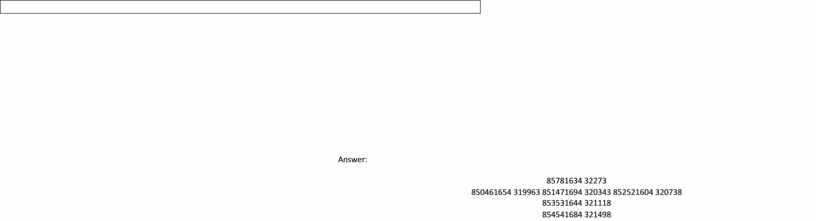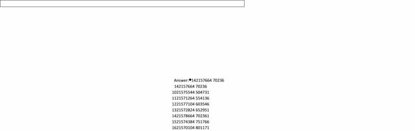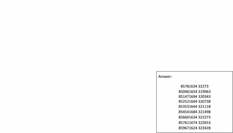 Answer: 85781634 32273 850461654 319963 851471694 320343 852521604 320738 853531644 321118 854541684 321498 856601634 322273 857611674 322653 859671624 323428 |