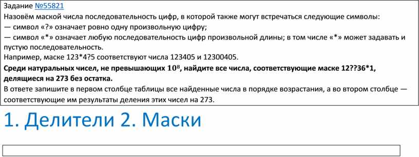 Задание №55821 Назовём маской числа последовательность цифр, в которой также могут встречаться следующие символы: — символ «?» означает ровно одну произвольную цифру; — символ «*» означает любую последовательность цифр произвольной длины; в том числе «*» может задавать и пустую последовательность. Например, маске 123*4?5 соответствуют числа 123405 и 12300405. Среди натуральных чисел, не превышающих 𝟏𝟎𝟖, найдите все числа, соответствующие маске 12??36*1, делящиеся на 273 без остатка. В ответе запишите в первом столбце таблицы все найденные числа в порядке возрастания, а во втором столбце — соответствующие им результаты деления этих чисел на 273. |