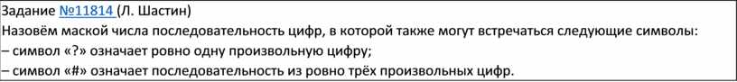 Например, маске 123#4?5 соответствуют числа 123333405 и 123001405.