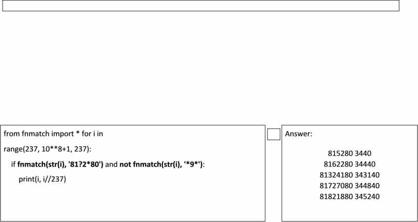 from fnmatch import * for i in range(237, 10**8+1, 237): if fnmatch(str(i), '81?2*80') and not fnmatch(str(i), '*9*'): print(i, i//237) |
