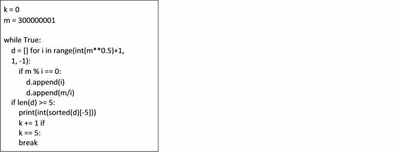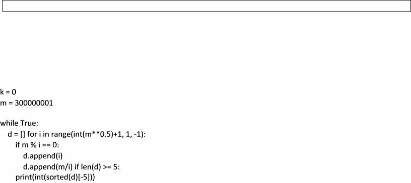 k = 0 m = 300000001 while True: d = [] for i in range(int(m**0.5)+1, 1, -1): if m % i == 0: d.append(i) d.append(m/i) if len(d) >= 5: print(int(sorted(d)[-5])) k += 1 if k == 5: break m += 1 |