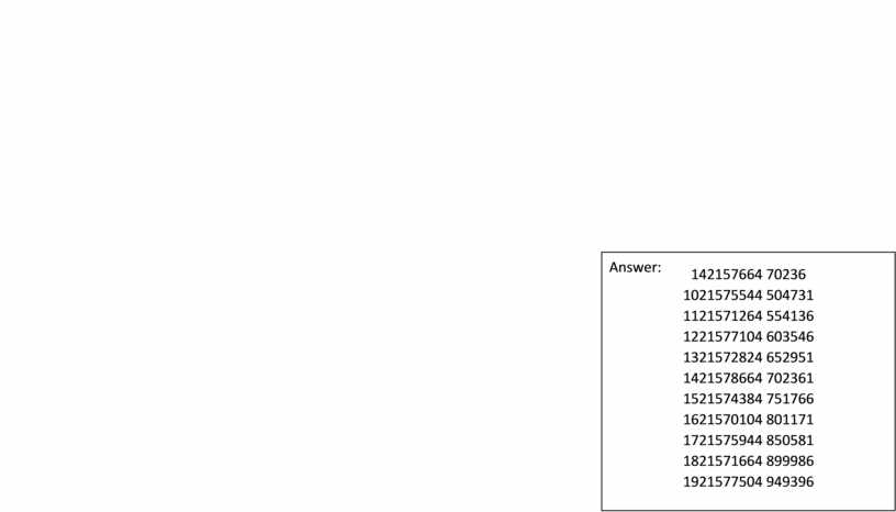 Answer: 2110768579 1187827 2135468879 1201727 2137068179 1202627 2161768479 1216527 2186468779 1230427 2188068079 1231327 |