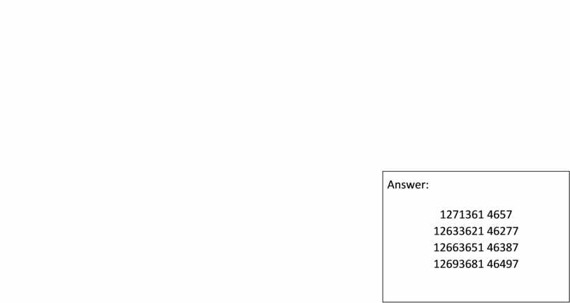 Answer: 1271361 4657 12633621 46277 12663651 46387 12693681 46497 |