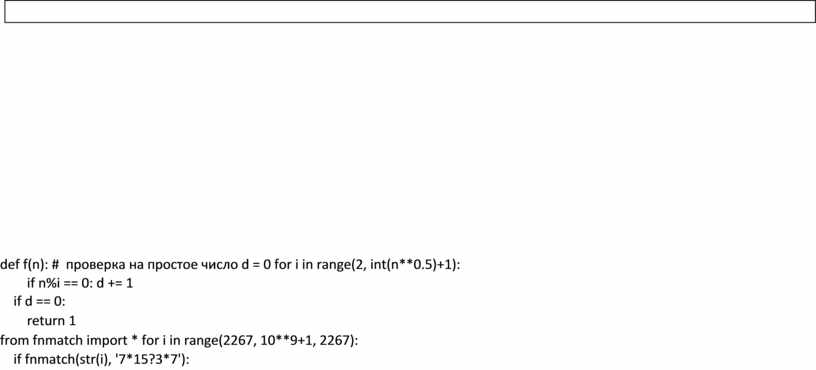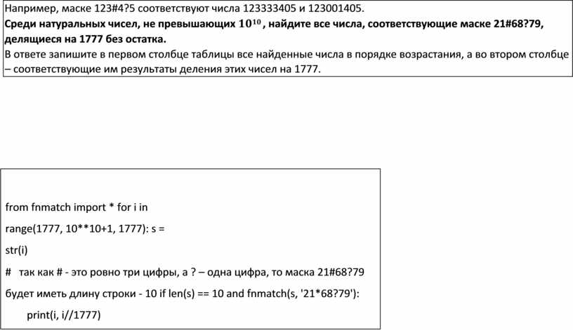 from fnmatch import * for i in range(1777, 10**10+1, 1777): s = str(i) # так как # - это ровно три цифры, а ? – одна цифра, то маска 21#68?79 будет иметь длину строки - 10 if len(s) == 10 and fnmatch(s, '21*68?79'): print(i, i//1777) |