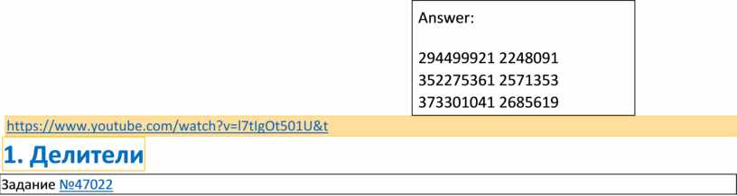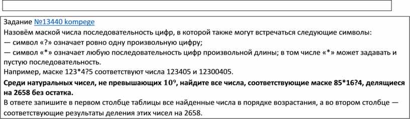 Задание №13440 kompege Назовём маской числа последовательность цифр, в которой также могут встречаться следующие символы: — символ «?» означает ровно одну произвольную цифру; — символ «*» означает любую последовательность цифр произвольной длины; в том числе «*» может задавать и пустую последовательность. Например, маске 123*4?5 соответствуют числа 123405 и 12300405. Среди натуральных чисел, не превышающих 𝟏𝟎𝟗, найдите все числа, соответствующие маске 85*16?4, делящиеся на 2658 без остатка. В ответе запишите в первом столбце таблицы все найденные числа в порядке возрастания, а во втором столбце — соответствующие результаты деления этих чисел на 2658. |