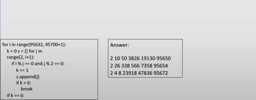 for i in range(95632, 95700+1): k = 0 s = [] for j in range(2, i+1): if i % j == 0 and j % 2 == 0: k += 1 s.append(j) if k > 6: break if k == 6: |