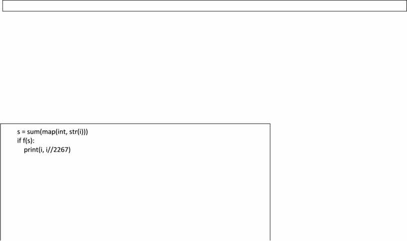 def f(n): # проверка на простое число d = 0 for i in range(2, int(n**0.5)+1): if n%i == 0: d += 1 if d == 0: return 1 from fnmatch import * for i in range(2267, 10**9+1, 2267): if fnmatch(str(i), '7*15?3*7'): s = sum(map(int, str(i))) if f(s): print(i, i//2267) |