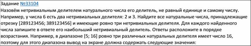 Назовём нетривиальным делителем натурального числа его делитель, не равный единице и самому числу. Например, у числа 6 есть два нетривиальных делителя: 2 и 3. Найдите все натуральные числа, принадлежащие отрезку [289123456; 389123456] и имеющие ровно три нетривиальных делителя. Для каждого найденного числа запишите в ответе его наибольший нетривиальный делитель. Ответы расположите в порядке возрастания. Например, в диапазоне [5; 16] ровно три различных натуральных делителя имеет число 16, поэтому для этого диапазона вывод на экране должна содержать следующие значения: