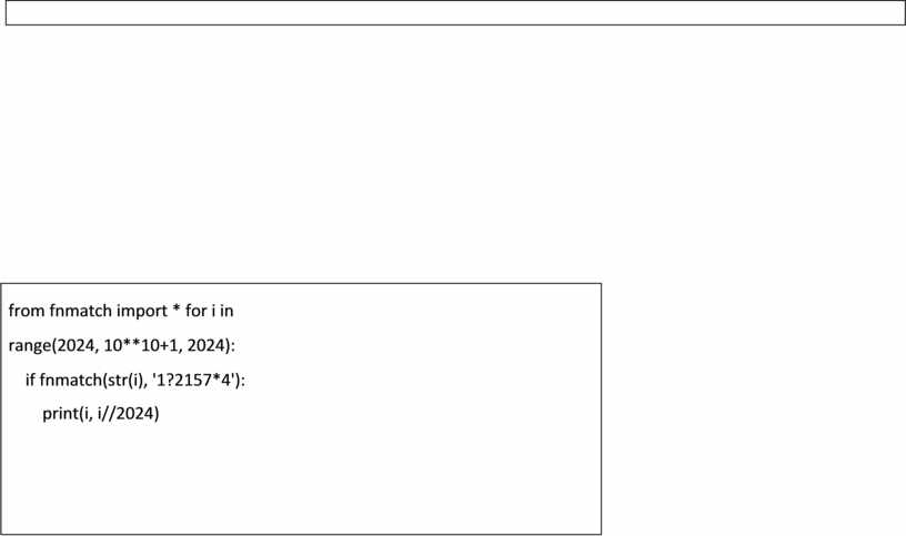 from fnmatch import * for i in range(2024, 10**10+1, 2024): if fnmatch(str(i), '1?2157*4'): print(i, i//2024) |