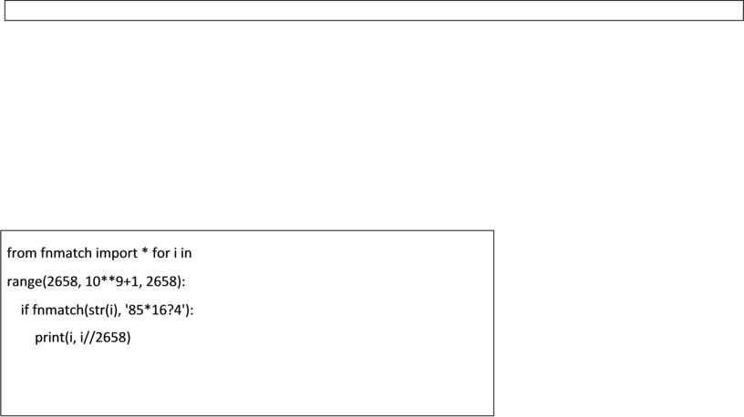 from fnmatch import * for i in range(2658, 10**9+1, 2658): if fnmatch(str(i), '85*16?4'): print(i, i//2658) |