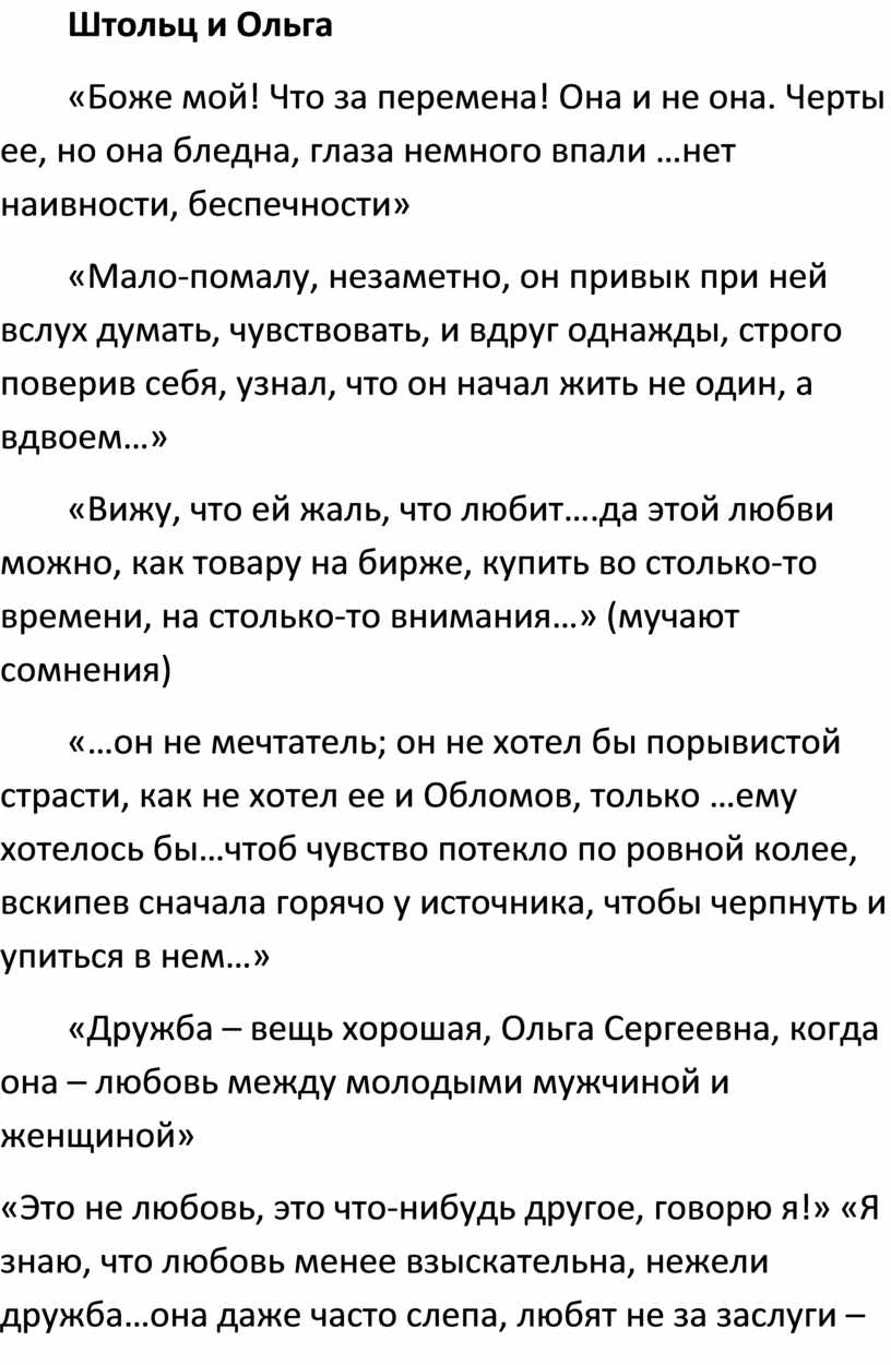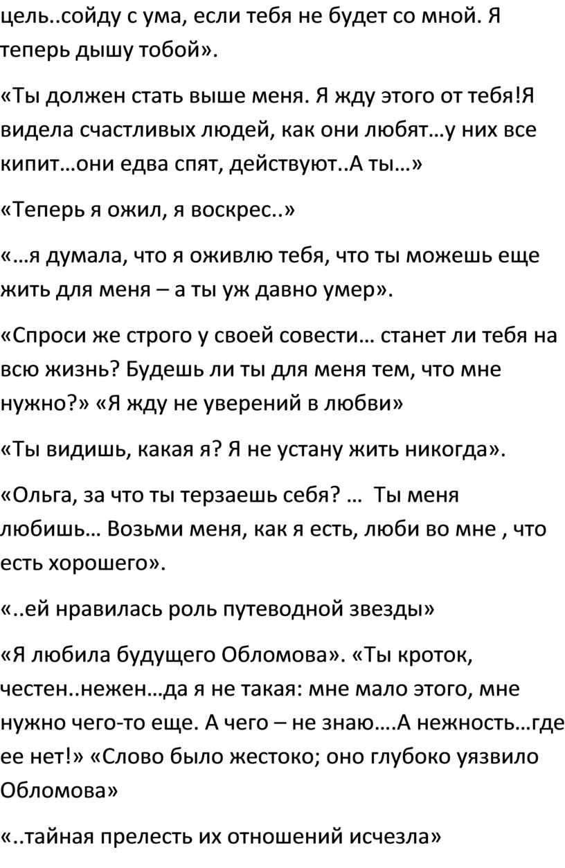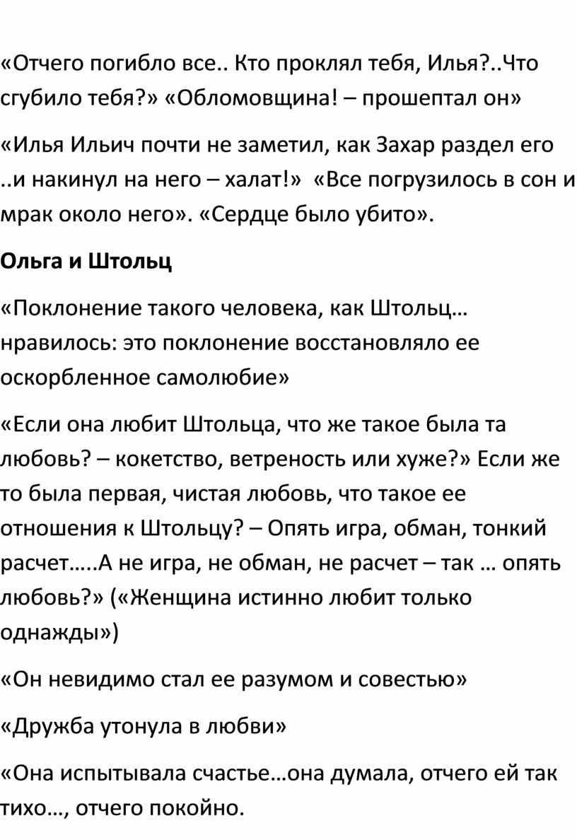 «Я любила будущего Обломова». «Ты кроток, честен..нежен…да я не такая: мне мало этого, мне нужно чего-то еще. А чего – не знаю….А нежность…где ее нет!» «Слово было жестоко; оно глубоко уязвило Обломова»