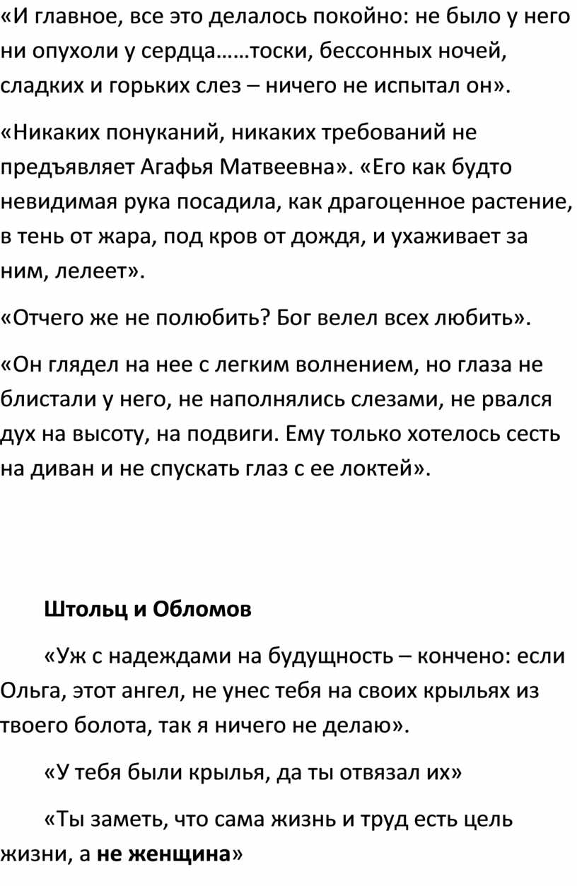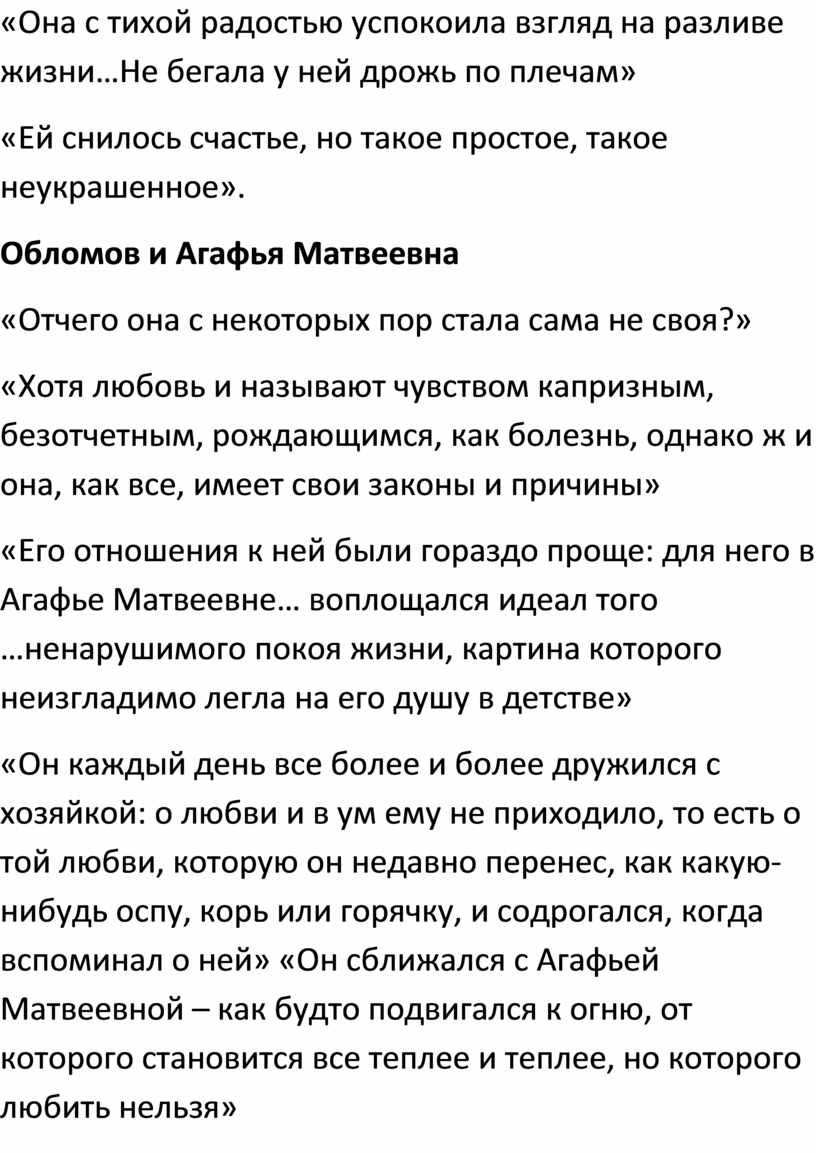 «Никаких понуканий, никаких требований не предъявляет Агафья Матвеевна». «Его как будто невидимая рука посадила, как драгоценное растение, в тень от жара, под кров от дождя, и ухаживает за ним, лелеет».