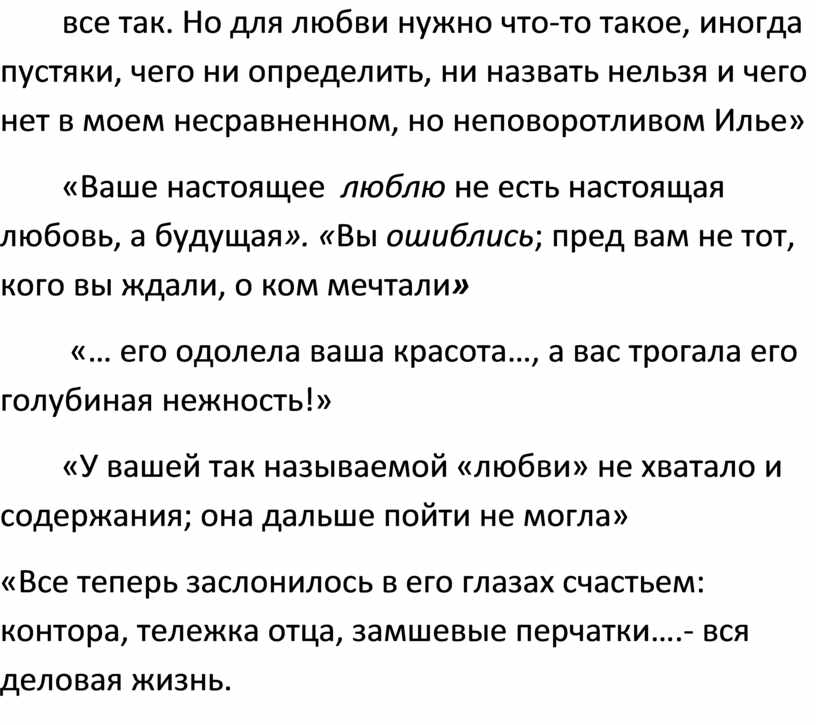 «Это не любовь, это что-нибудь другое, говорю я!» «Я знаю, что любовь менее взыскательна, нежели дружба…она даже часто слепа, любят не за заслуги – все так. Но для любви нужно что-то такое, иногда пустяки, чего ни определить, ни назвать нельзя и чего нет в моем несравненном, но неповоротливом Илье»