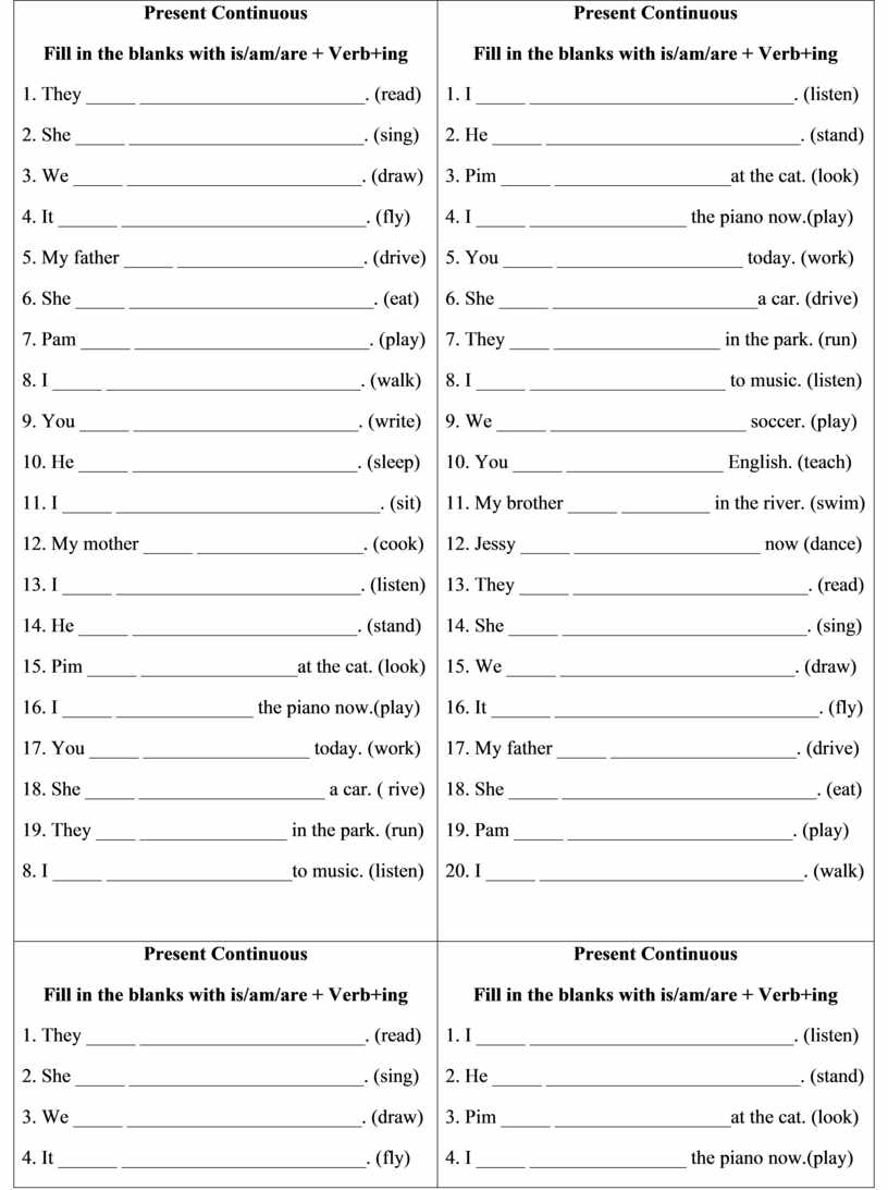 Present Continuous Fill in the blanks with is/am/are + Verb+ing 1. They _____ _______________________. (read) 2. She _____ ________________________. (sing) 3. We _____ ________________________. (draw) 4. It ______ _________________________. (fly) 5. My father _____ ___________________. (drive) 6. She _____ _________________________. (eat) 7. Pam _____ ________________________. (play) 8. I _____ __________________________. (walk) 9. You _____ _______________________. (write) 10. He _____ _______________________. (sleep) 11. I _____ ___________________________. (sit) 12. My mother _____ _________________. (cook) 13. I _____ _________________________. (listen) 14. He _____ _______________________. (stand) 15. Pim _____ ________________at the cat. (look) 16. I _____ ______________ the piano now.(play) 17. You _____ _________________ today. (work) 18. She _____ __________________a car. ( drive) 19. They ____ _______________ in the park. (run) 20. I _____ __________________to music. (listen)