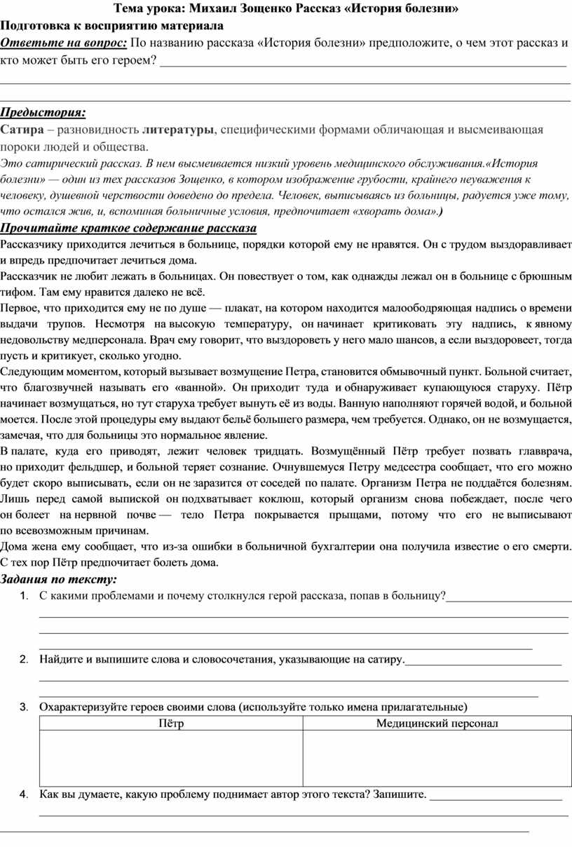 Ответьте на вопрос: По названию рассказа «История болезни» предположите, о чем этот рассказ и кто может быть его героем? ______________________________________________________________
