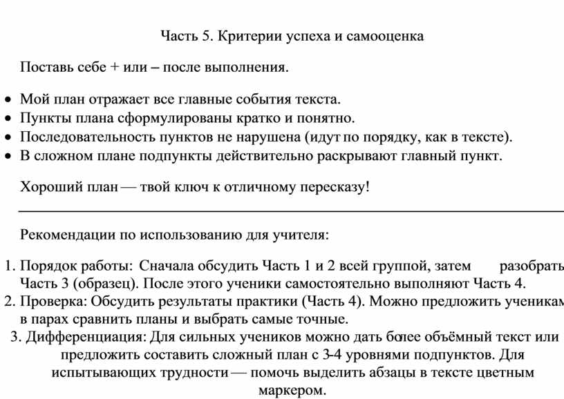 3. Дифференциация: Для сильных учеников можно дать более объёмный текст или предложить составить сложный план с 3-4 уровнями подпунктов. Для испытывающих трудности — помочь выделить абзацы в тексте цветным маркером.