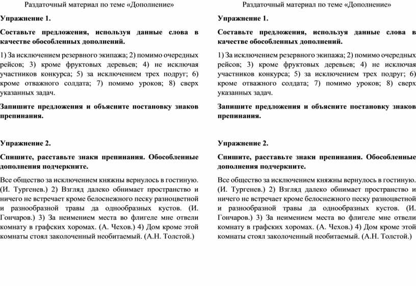 1) За исключением резервного экипажа; 2) помимо очередных рейсов; 3) кроме фруктовых деревьев; 4) не исключая участников конкурса; 5) за исключением трех подруг; 6) кроме отважного солдата; 7) помимо уроков; 8) сверх указанных задач.