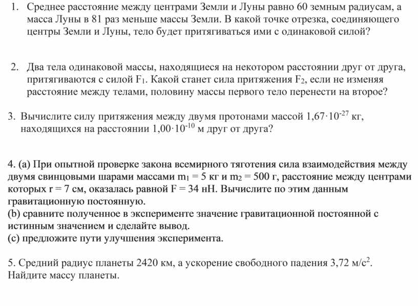 1. Среднее расстояние между центрами Земли и Луны равно 60 земным радиусам, а масса Луны в 81 раз меньше массы Земли. В какой точке отрезка, соединяющего центры Земли и Луны, тело будет притягиваться ими с одинаковой силой?