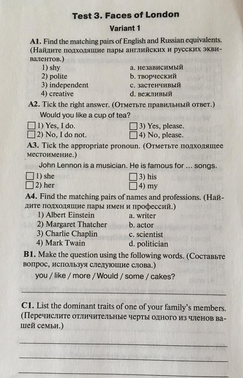 Данный раздаточный материал представляет собой тест для учащихся 6 класса, изучающих английский язык по учебнику М. Биболетовой и Н. Трубаневой. Тест состоит из лексических и грамматических заданий по теме "Faces of London" ( вариант 1). Данный тест составлен в соответствии с требованиями ФГОС.