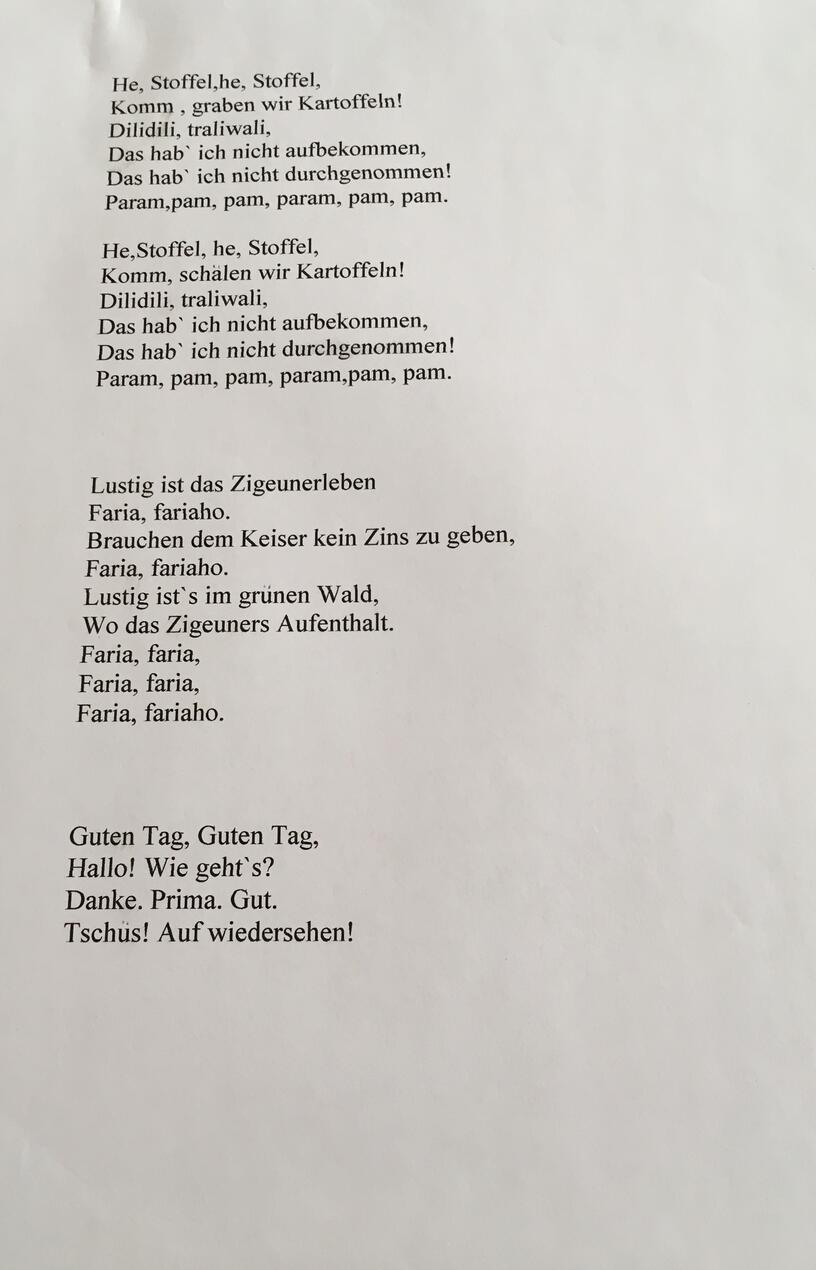 Данный раздаточный материал представляет собой тексты нескольких песенок на немецком языке. Использование песен на уроках помогает разнообразить урок, включает социо-культурный компонент, дает возможность поработать над фонетикой и грамматикой. Песни можно использовать как на уроках, так и во время внеурочной деятельности.