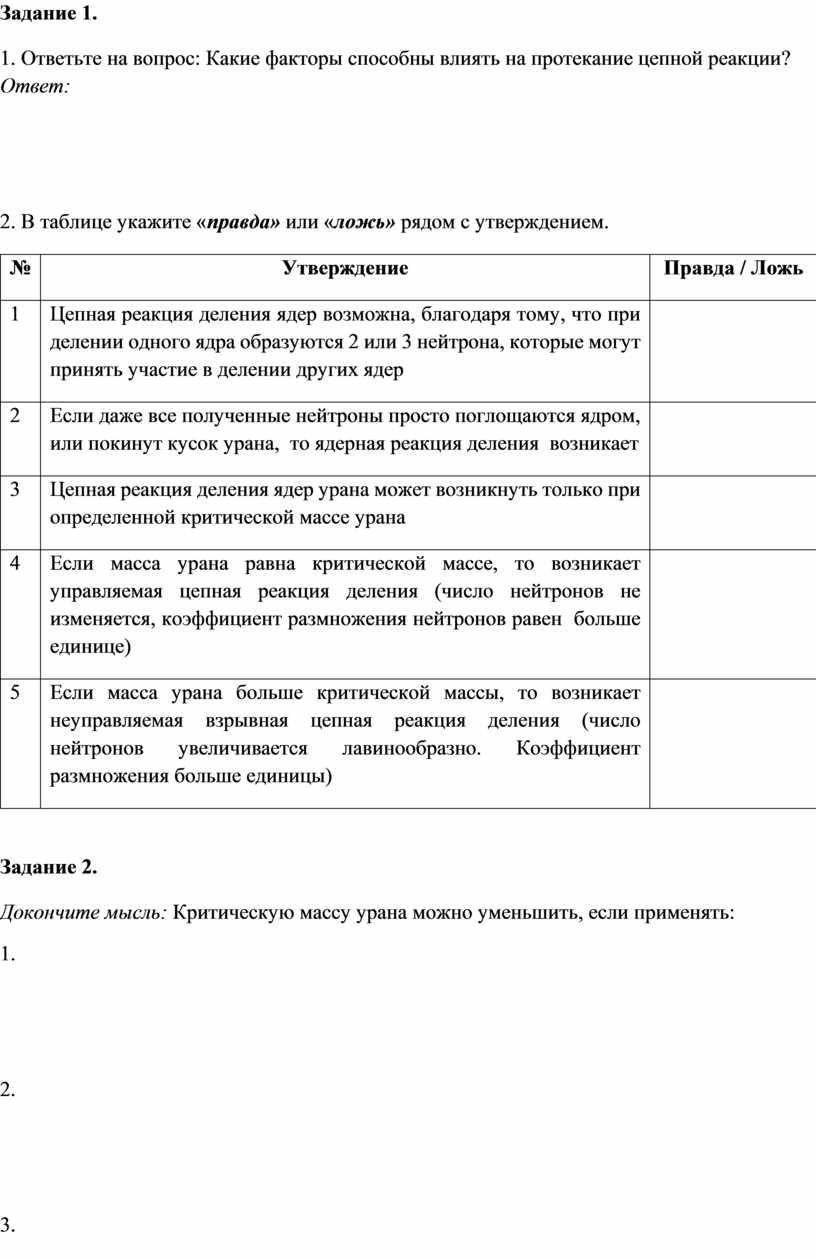 1. Ответьте на вопрос: Какие факторы способны влиять на протекание цепной реакции?