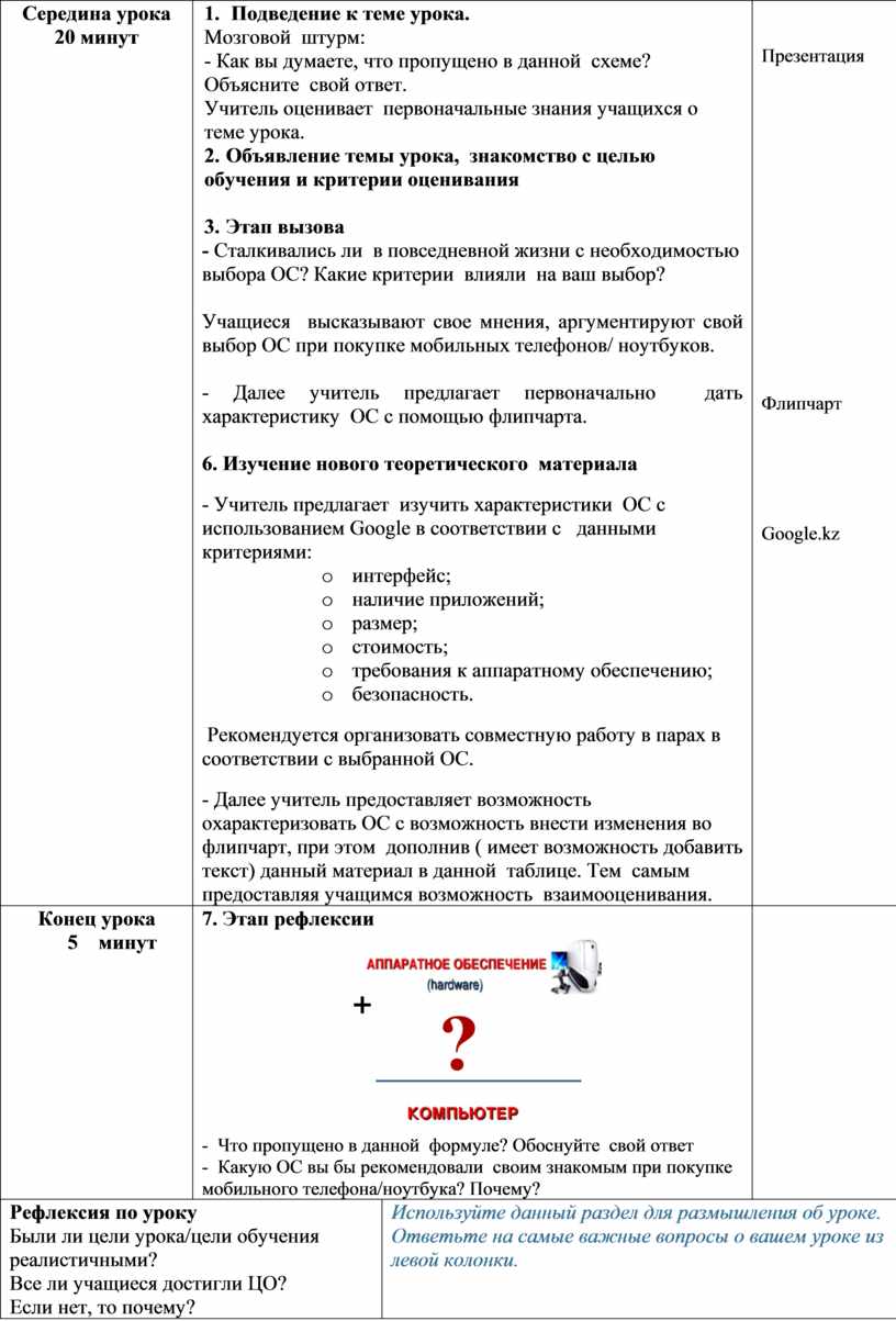 6. Изучение нового теоретического материала - Учитель предлагает изучить характеристики ОС с использованием Google в соответствии с данными критериями: o интерфейс; o наличие приложений; o размер; o стоимость; o требования к аппаратному обеспечению; o безопасность. Рекомендуется организовать совместную работу в парах в соответствии с выбранной ОС. - Далее учитель предоставляет возможность охарактеризовать ОС с возможность внести изменения во флипчарт, при этом дополнив ( имеет возможность добавить текст) данный материал в данной таблице. Тем самым предоставляя учащимся возможность взаимооценивания. |