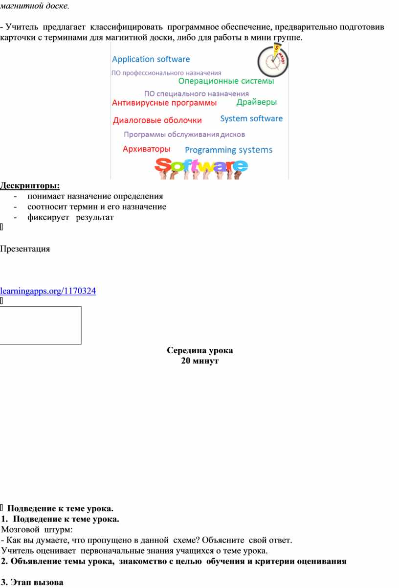 - Учитель предлагает классифицировать программное обеспечение, предварительно подготовив карточки с терминами для магнитной доски, либо для работы в мини группе.