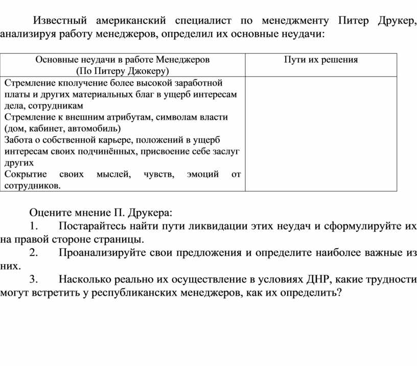 Известный американский специалист по менеджменту Питер Друкер, анализируя работу менеджеров, определил их основные неудачи:
