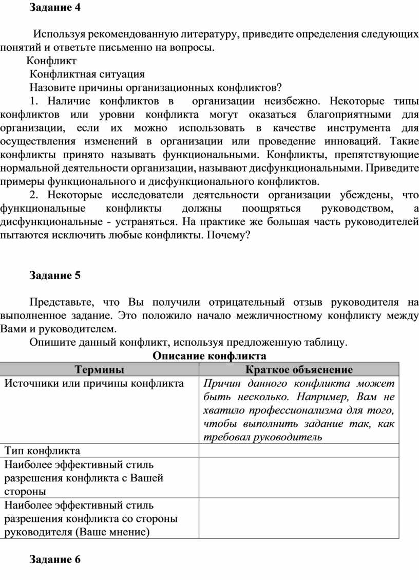 1. Наличие конфликтов в организации неизбежно. Некоторые типы конфликтов или уровни конфликта могут оказаться благоприятными для организации, если их можно использовать в качестве инструмента для осуществления изменений в организации или проведение инноваций. Такие конфликты принято называть функциональными. Конфликты, препятствующие нормальной деятельности организации, называют дисфункциональными. Приведите примеры функционального и дисфункционального конфликтов.