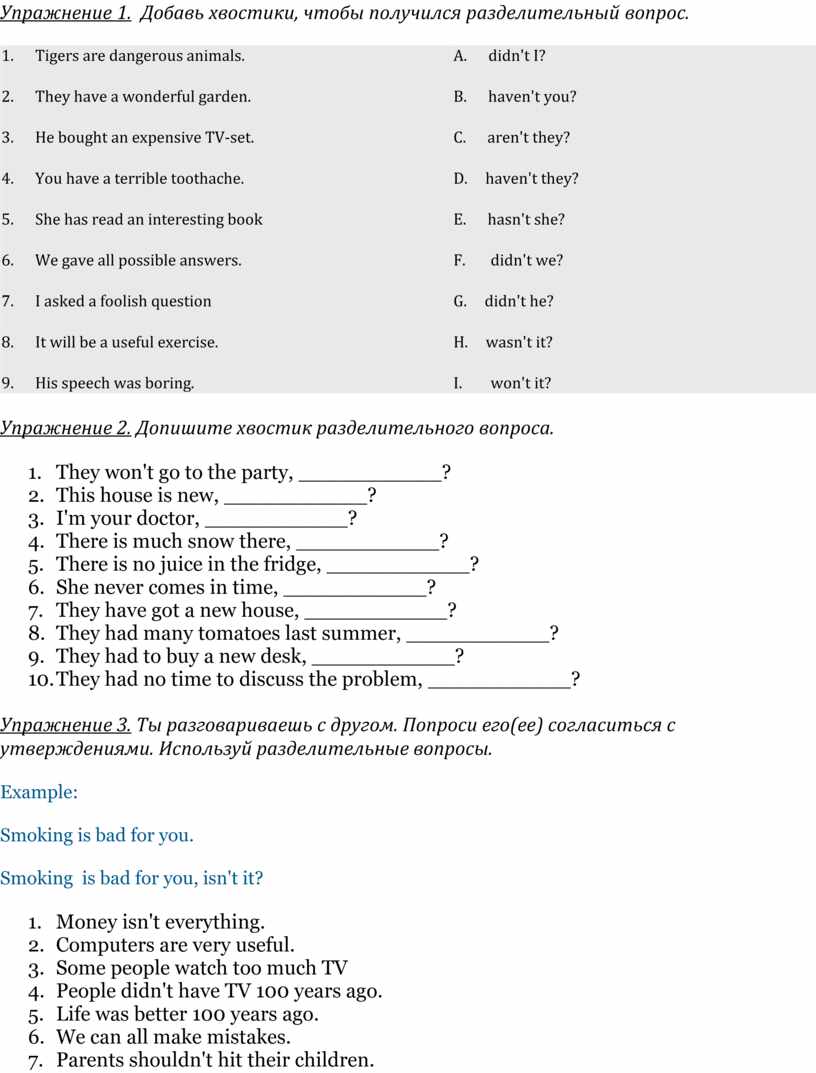 Упражнение 1. Добавь хвостики, чтобы получился разделительный вопрос.