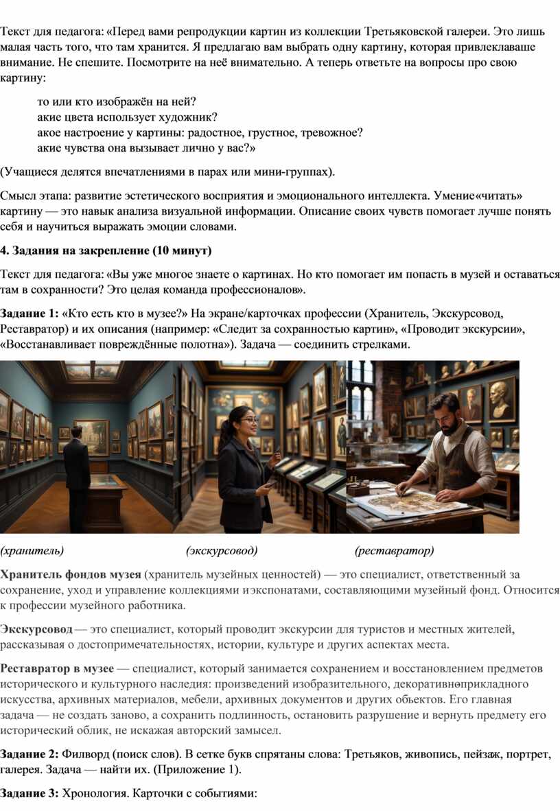 Задание 1: «Кто есть кто в музее?» На экране/карточках профессии (Хранитель, Экскурсовод, Реставратор) и их описания (например: «Следит за сохранностью картин», «Проводит экскурсии», «Восстанавливает повреждённые полотна»). Задача — соединить стрелками.