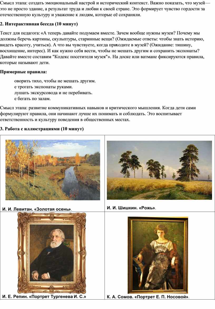 Текст для педагога: «А теперь давайте подумаем вместе. Зачем вообще нужны музеи? Почему мы должны беречь картины, скульптуры, старинные вещи? (Ожидаемые ответы: чтобы знать историю, видеть красоту, учиться). А что вы чувствуете, когда приходите в музей? (Ожидание: тишину, восхищение, интерес). И как нужно себя вести, чтобы не мешать другим и сохранить экспонаты? Давайте вместе составим "Кодекс посетителя музея"». На доске или ватмане фиксируются правила, которые называют дети.
