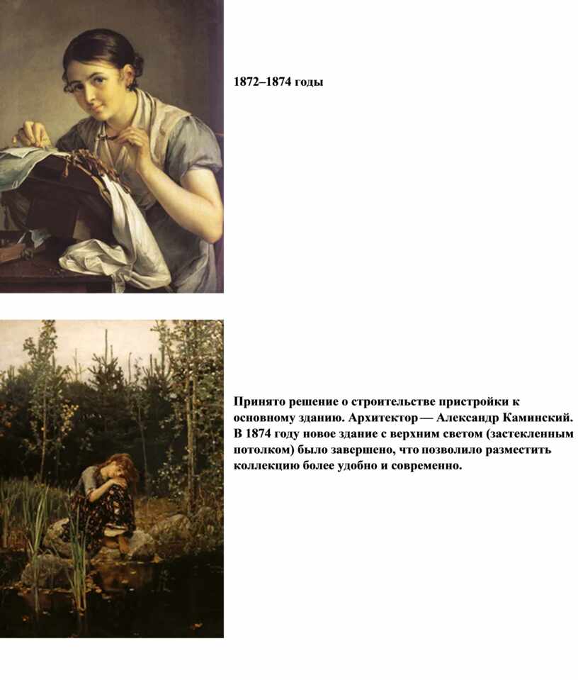 Принято решение о строительстве пристройки к основному зданию. Архитектор — Александр Каминский. В 1874 году новое здание с верхним светом (застекленным потолком) было завершено, что позволило разместить коллекцию более удобно и современно. |