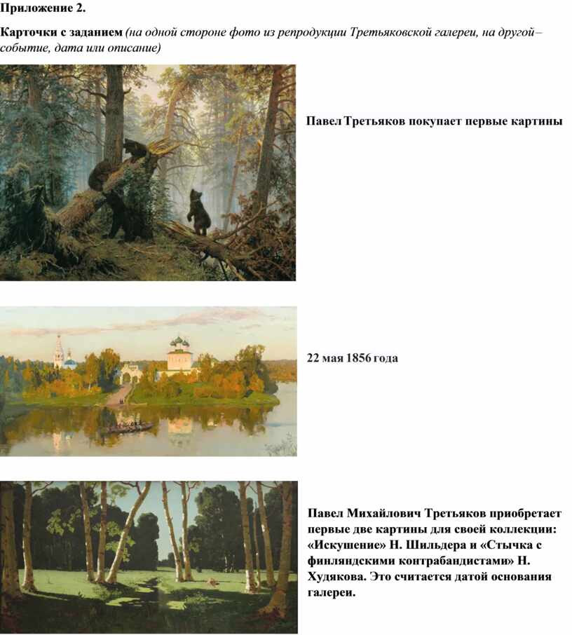 Карточки с заданием (на одной стороне фото из репродукции Третьяковской галереи, на другой – событие, дата или описание)