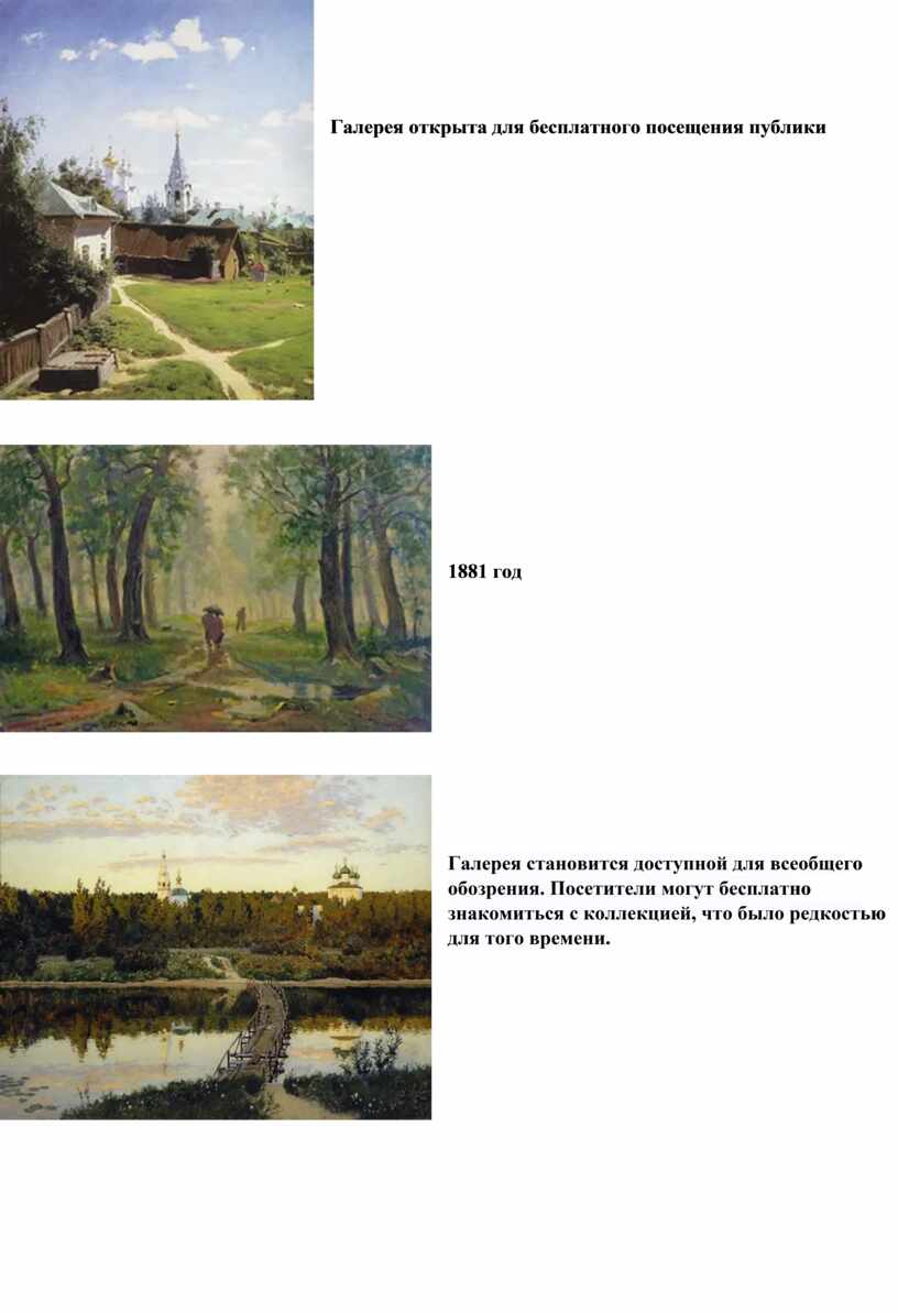 Галерея становится доступной для всеобщего обозрения. Посетители могут бесплатно знакомиться с коллекцией, что было редкостью для того времени. |