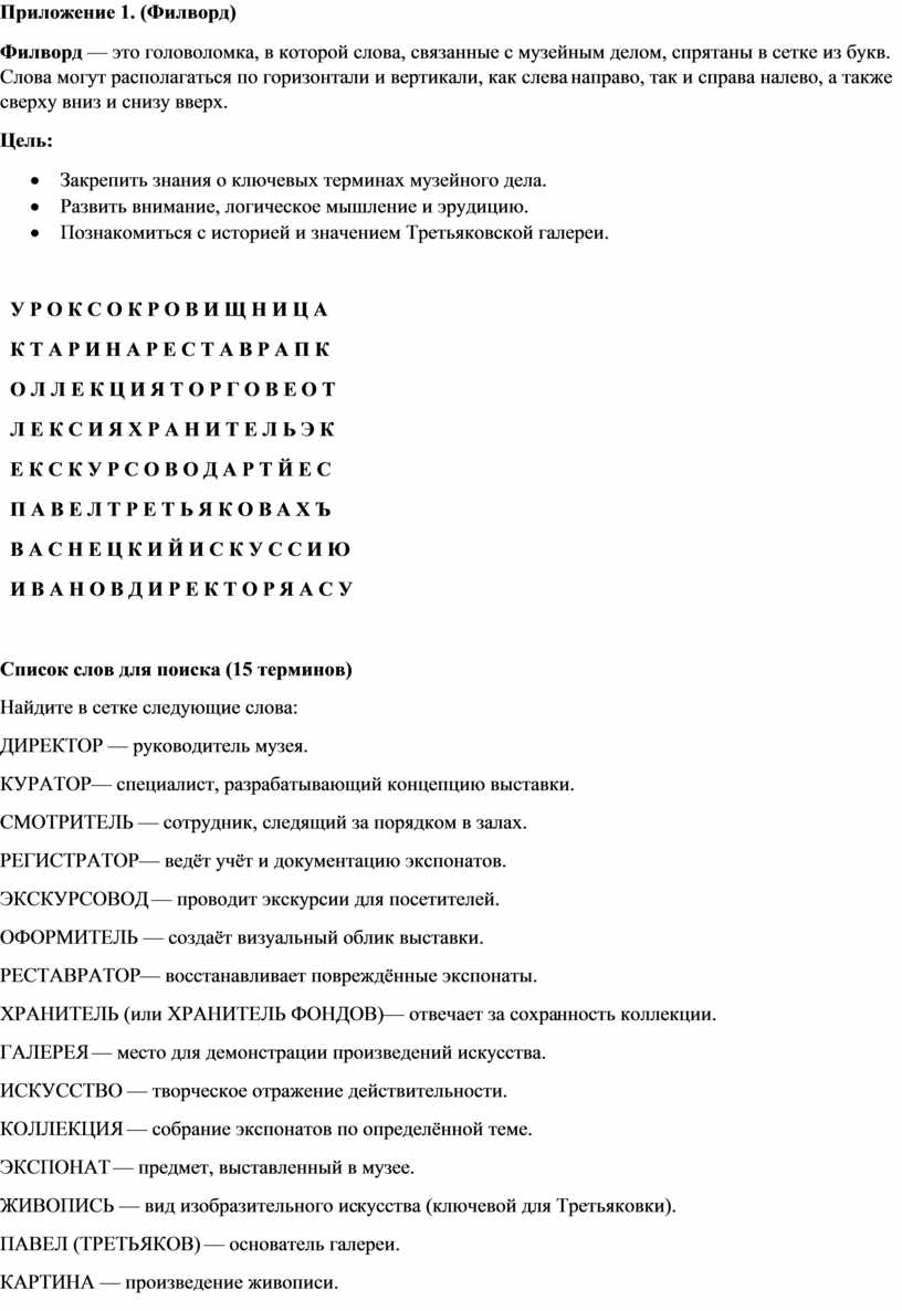 Задание 2: Филворд (поиск слов). В сетке букв спрятаны слова: Третьяков, живопись, пейзаж, портрет, галерея. Задача — найти их. (Приложение 1).
