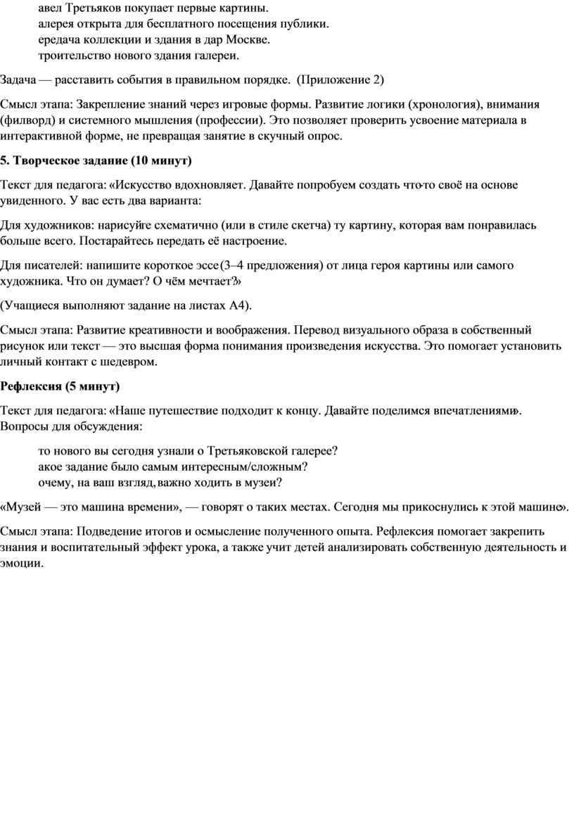 Текст для педагога: «Ребята, сегодня мы поговорим о месте, которое знает каждый, кто хоть немного интересуется искусством в России. В 2026 году исполняется 170 лет со дня основания Третьяковской галереи. Но с чего всё начиналось? В середине XIX века в Москве жил купец и меценат Павел Михайлович Третьяков. Он не просто собирал картины — он мечтал создать национальную галерею, чтобы искусство стало доступно всем. Свою коллекцию он передал в дар городу Москве. Так началась история одного из самых известных музеев мира. Сегодня мы попробуем почувствовать себя частью этой большой истории.