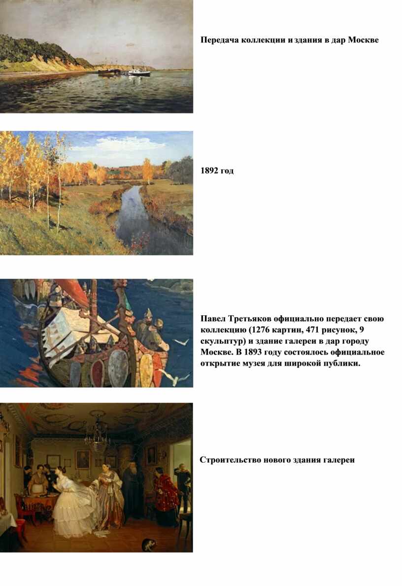 Павел Третьяков официально передает свою коллекцию (1276 картин, 471 рисунок, 9 скульптур) и здание галереи в дар городу Москве. В 1893 году состоялось официальное открытие музея для широкой публики. |