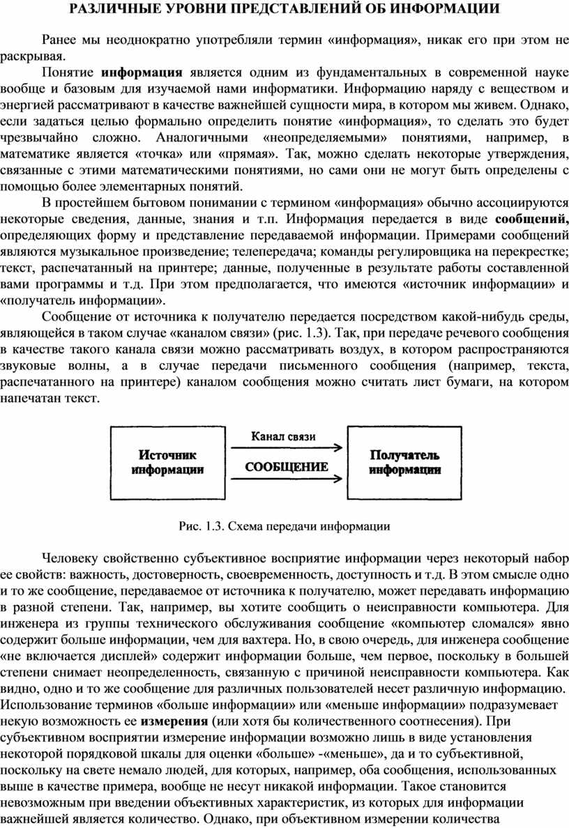 В простейшем бытовом понимании с термином «информация» обычно ассоциируются некоторые сведения, данные, знания и т.п. Информация передается в виде сообщений, определяющих форму и представление передаваемой информации. Примерами сообщений являются музыкальное произведение; телепередача; команды регулировщика на перекрестке; текст, распечатанный на принтере; данные, полученные в результате работы составленной вами программы и т.д. При этом предполагается, что имеются «источник информации» и «получатель информации».